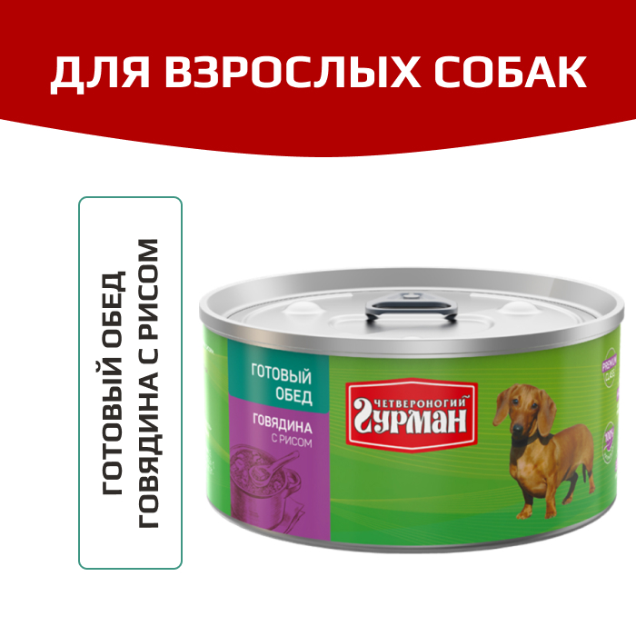 Четвероногий Гурман Готовый обед корм консервированный для собак говядина с рисом.