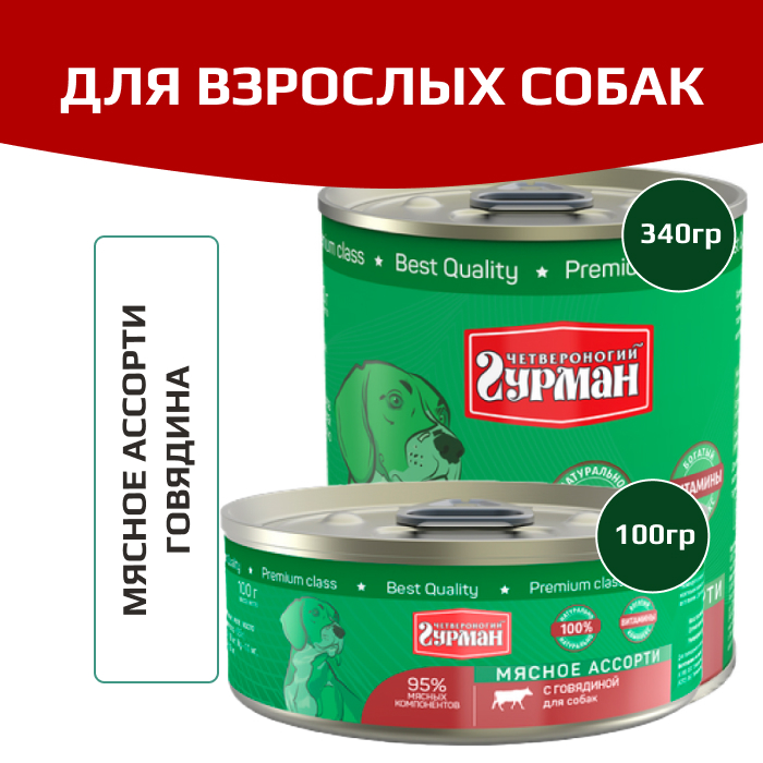 Четвероногий Гурман Мясное ассорти корм консервированный для собак говядина.