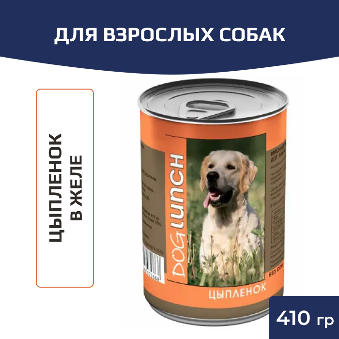 Dog Lunch (Дог Ланч) консервы для собак цыпленок в желе обеспечит вашей собаке качественное питание с полноценной смесью всех необходимых ингредиентов. Dog Lunch (Дог Ланч) - это полностью сбалансированное питание, входящие в состав злаки обеспечивают собаку энергией и способствуют здоровому метаболизму. Корм производится только из мяса не менее 60 % и в качестве основы использует говядину. В консервах Dog Lunch (Дог Ланч) не используется соя, искусственные красители, усилители вкуса и консерванты. Благодаря особенно щадящей обработки при производстве консервов, сохраняются все питательные вещества мяса, энергетическая ценность продукта и вкус. Рецепт разработан с учетом всех потребносте собак всех пород и размеров, обеспечивает высокую усваиваемость продукта, не содержит искусственных красителей и ароматизаторов.