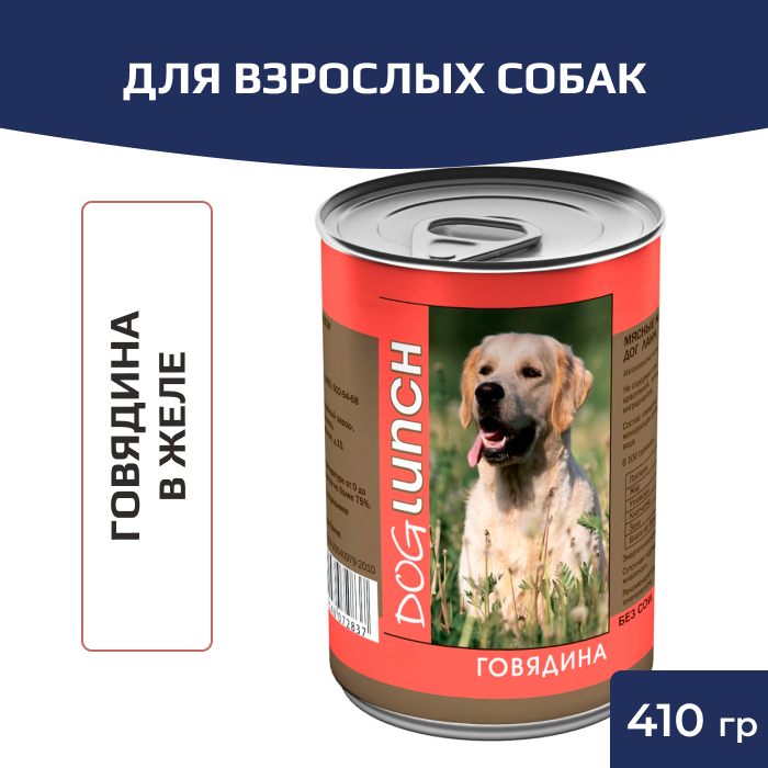 Dog Lunch (Дог Ланч) консервы для собак говядина в желе обеспечит вашей собаке качественное питание с полноценной смесью всех необходимых ингредиентов. Dog Lunch (Дог Ланч) - это полностью сбалансированное питание, входящие в состав злаки обеспечивают собаку энергией и способствуют здоровому метаболизму. Корм производится только из мяса не менее 60 % и в качестве основы использует говядину. В консервах Dog Lunch (Дог Ланч) не используется соя, искусственные красители, усилители вкуса и консерванты. Благодаря особенно щадящей обработки при производстве консервов, сохраняются все питательные вещества мяса, энергетическая ценность продукта и вкус. Рецепт разработан с учетом всех потребносте собак всех пород и размеров, обеспечивает высокую усваиваемость продукта, не содержит искусственных красителей и ароматизаторов.