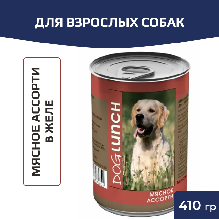 Dog Lunch (Дог Ланч) консервы для собак мясное ассорти в желе обеспечит вашей собаке качественное питание с полноценной смесью всех необходимых ингредиентов. Dog Lunch (Дог Ланч) - это полностью сбалансированное питание, входящие в состав злаки обеспечивают собаку энергией и способствуют здоровому метаболизму. Корм производится только из мяса не менее 60 % и в качестве основы использует говядину. В консервах Dog Lunch (Дог Ланч) не используется соя, искусственные красители, усилители вкуса и консерванты. Благодаря особенно щадящей обработки при производстве консервов, сохраняются все питательные вещества мяса, энергетическая ценность продукта и вкус. Рецепт разработан с учетом всех потребносте собак всех пород и размеров, обеспечивает высокую усваиваемость продукта, не содержит искусственных красителей и ароматизаторов.