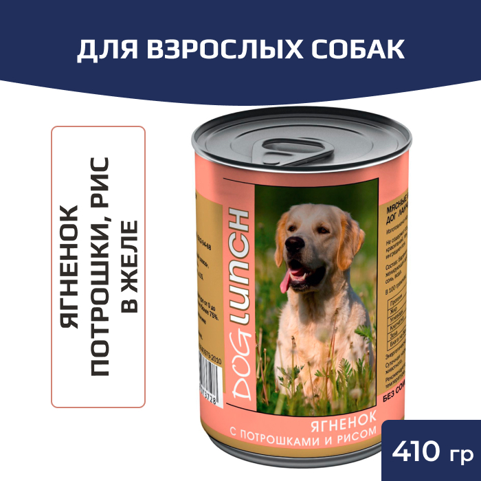 Dog Lunch (Дог Ланч) консервы для собак ягненок с потрошками и рисом в желе обеспечит вашей собаке качественное питание с полноценной смесью всех необходимых ингредиентов. Dog Lunch (Дог Ланч) - это полностью сбалансированное питание, входящие в состав злаки обеспечивают собаку энергией и способствуют здоровому метаболизму. Корм производится только из мяса не менее 60 % и в качестве основы использует говядину. В консервах Dog Lunch (Дог Ланч) не используется соя, искусственные красители, усилители вкуса и консерванты. Благодаря особенно щадящей обработки при производстве консервов, сохраняются все питательные вещества мяса, энергетическая ценность продукта и вкус. Рецепт разработан с учетом всех потребносте собак всех пород и размеров, обеспечивает высокую усваиваемость продукта, не содержит искусственных красителей и ароматизаторов.