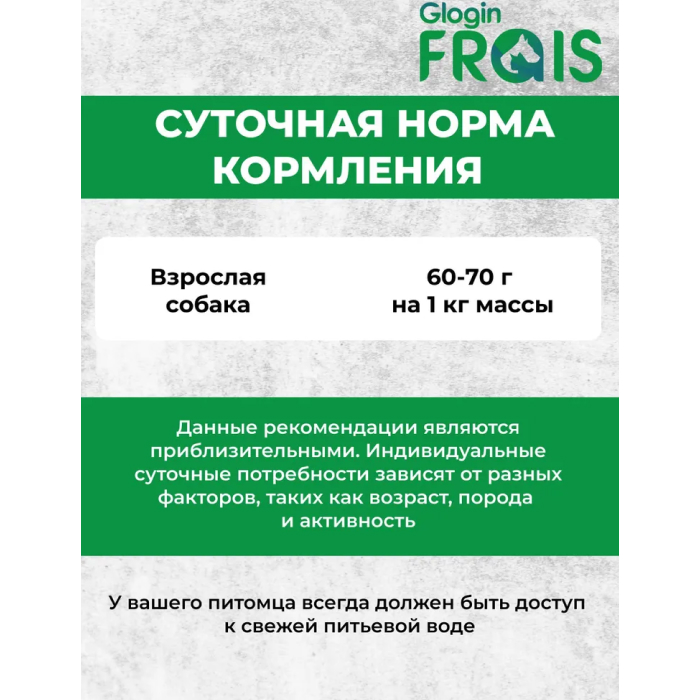 для взрослой собаки суточная норма корма в день примерно 60-70 г на 1 кг массы. Данные рекомендации являются приблизительными. Индивидуальные суточные потребности зависят от разных факторов, таких как возраст, порода и активность. Предоставьте животному достаточное количество питьевой воды.
