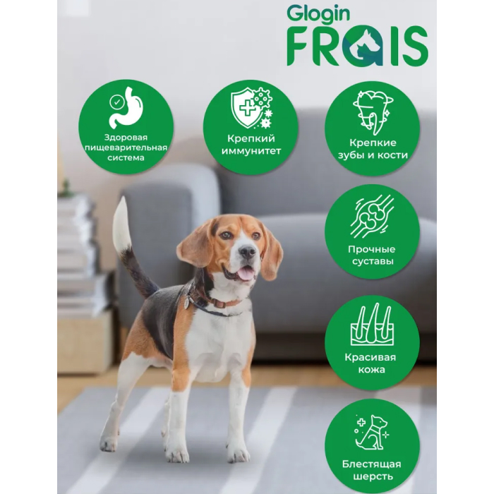 Консервированный корм для собак Glogin Frais класса Holistic сочные кусочки мяса в желе. Корма класса Холистик - это продукт нового поколения, который производится из продуктов, предназначенных для людей. Не так давно корма Холистик класса появились и в России. Корм этого класса сделан из натуральных ингредиентов, пригодных в пищу не только животным, но даже людям. Полнорационный корм для собак обогащен витаминами и минеральными веществами и имеет натуральный беззерновой состав. При производстве корма не используются костная мука, красители и ароматизаторы. Корм для собак изготавливается с использованием новейших технологий на современном оборудовании и не содержит ГМО и сои.