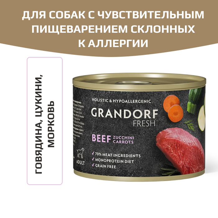 Grandorf Fresh Holistic & Hupoallergenic консервы для собак всех возрастов с нормальной активностью, чувствительным пищеварением или склонных к аллергии, говядина, цукини, морковь.
