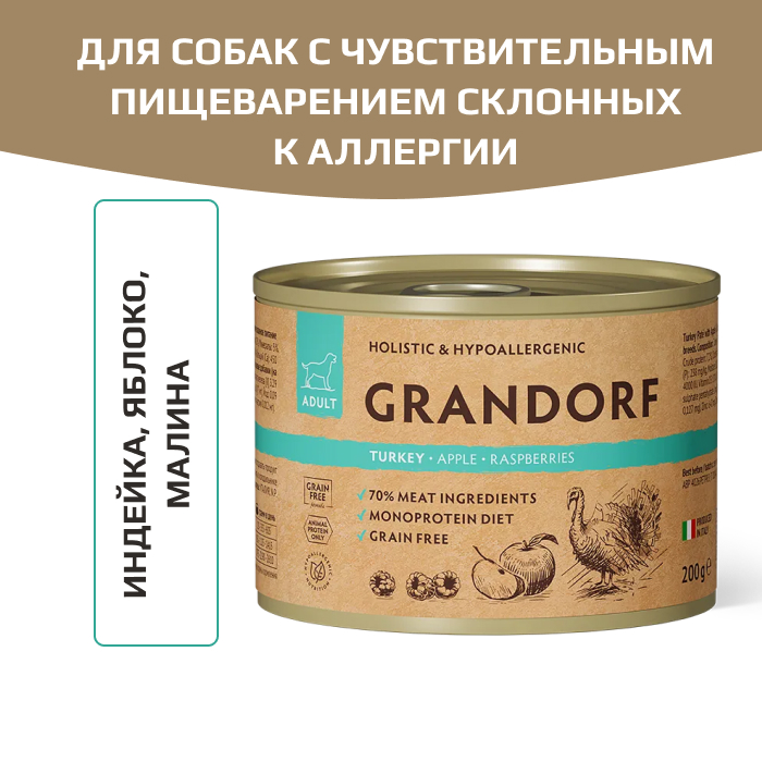 Grandorf Holistic & Hupoallergenic консервы для собак всех возрастов с нормальной активностью, чувствительным пищеварением или склонных к аллергии, индейка, яблоко, малина.