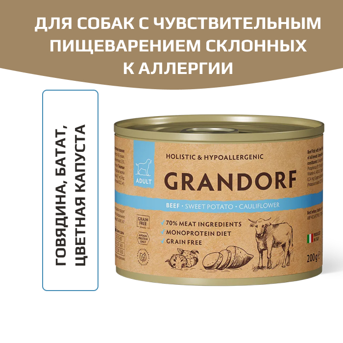Grandorf Holistic & Hupoallergenic консервы для собак всех возрастов с нормальной активностью, чувствительным пищеварением или склонных к аллергии, говядина, батат, цветная капуста.