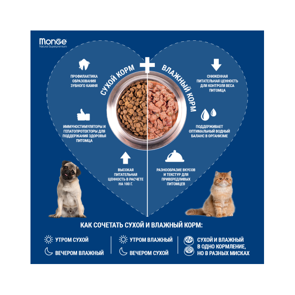 Рекомендуемую суточную порцию можно разделить на 2-3 приема кормления (см. таблицу на упаковке или на сайте). Индивидуальные потребности в питании могут отличаться в зависимости от размера, возраста и уровня активности животного. Данные предписания носят исключительно рекомендательный характер. Для достижения оптимального состояния животного может потребоваться изменения рациона. Переход на новый корм должен происходить в течение недели или более. Всегда оставляйте постоянный доступ к чистой питьевой воде. После вскрытия хранить в холодильнике и использовать в течение 2 дней (подробнее см. на упаковке). Корм для домашних животных не предназначен для употребления в пищу человеку.