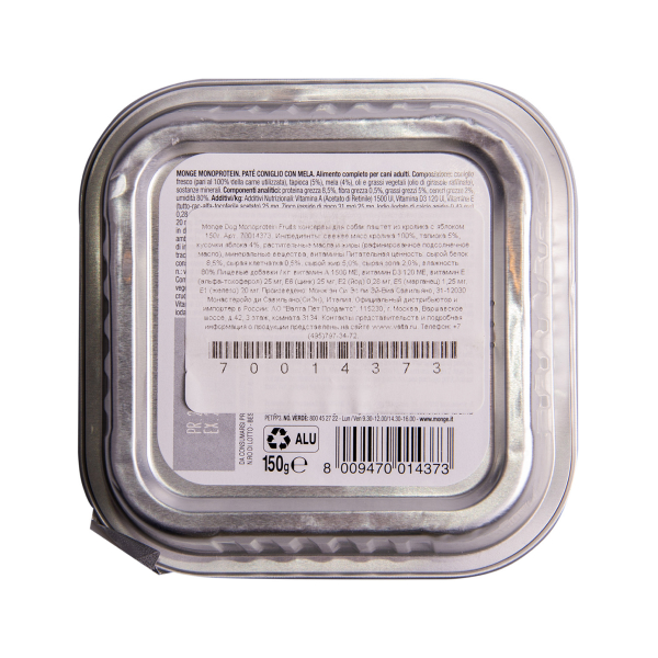 Ароматный мясной паштет из кролика с яблоком для собак, который содержит только один источник белка животного происхождения (кролик), тапиоку (в качестве источника углеводов) и сочное яблоко, которое является источником витаминов и минералов, а также богато клетчаткой, полезной для здоровья кишечника и пищеварения. GRAIN FREE формула и один источник белка животного происхождения в составе корма позволяют легко исключить из рациона ингредиенты, вызывающие аллергию. Без ГМО, искусственных красителей и ароматизаторов. Сделано в Италии.