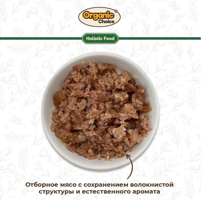 Organic Choice - монокомпонентные консервы для собак класса холистик. Рационы для животных Organic Choice - это корма класса холистик, для хозяев, которые заботятся о питании и здоровье своих питомцев. Для производства мы выбираем лучшие заводы России! А ингредиенты, из которых изготовлены корма, проходят тщательный отбор и соответствуют высоким мировым стандартам качества. Консервы не содержат злаки, ГМО, сою и ароматизаторы..