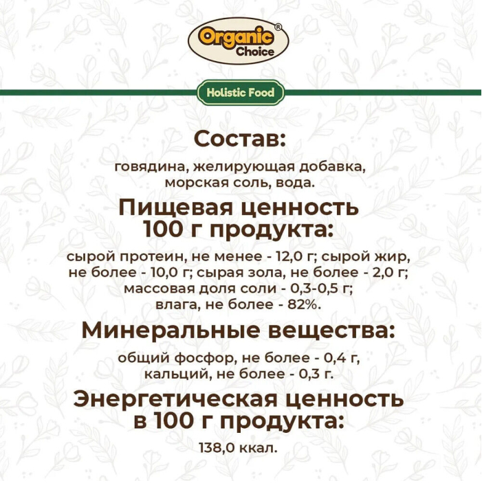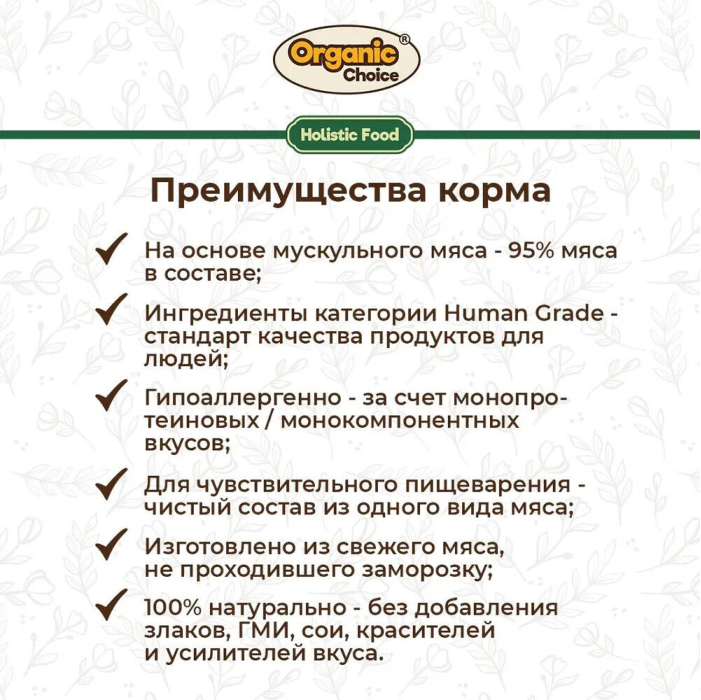 Organic Choice - монокомпонентные консервы для собак класса холистик. Рационы для животных Organic Choice - это корма класса холистик, для хозяев, которые заботятся о питании и здоровье своих питомцев. Для производства мы выбираем лучшие заводы России! А ингредиенты, из которых изготовлены корма, проходят тщательный отбор и соответствуют высоким мировым стандартам качества. Консервы не содержат злаки, ГМО, сою и ароматизаторы..
