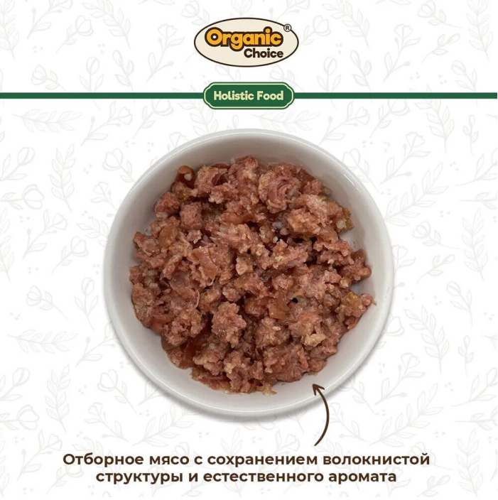 Organic Choice - монокомпонентные консервы для собак класса холистик. Рационы для животных Organic Choice - это корма класса холистик, для хозяев, которые заботятся о питании и здоровье своих питомцев. Для производства мы выбираем лучшие заводы России! А ингредиенты, из которых изготовлены корма, проходят тщательный отбор и соответствуют высоким мировым стандартам качества. Консервы не содержат злаки, ГМО, сою и ароматизаторы..