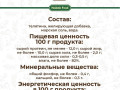 протеин - 12,0г, жир - 10,0г, зола - 2,0г, морская соль - 0,3-0,5г, влага- 82%, фосфор - 0,4г, кальций - 0,3г.