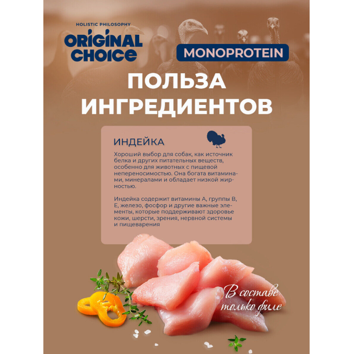 Забота о деталях – наш главный приоритет! ORIGINAL CHOICE MONOPROTEIN ADULT MINI разработан с учетом особенностей метаболизма маленьких пород, чтобы ваш питомец оставался энергичным и здоровым долгие годы. Подарите своему маленькому другу королевское питание! ORIGINAL CHOICE – это выбор тех, кто понимает, что размер питомца не определяет его потребности в качественном питании.
