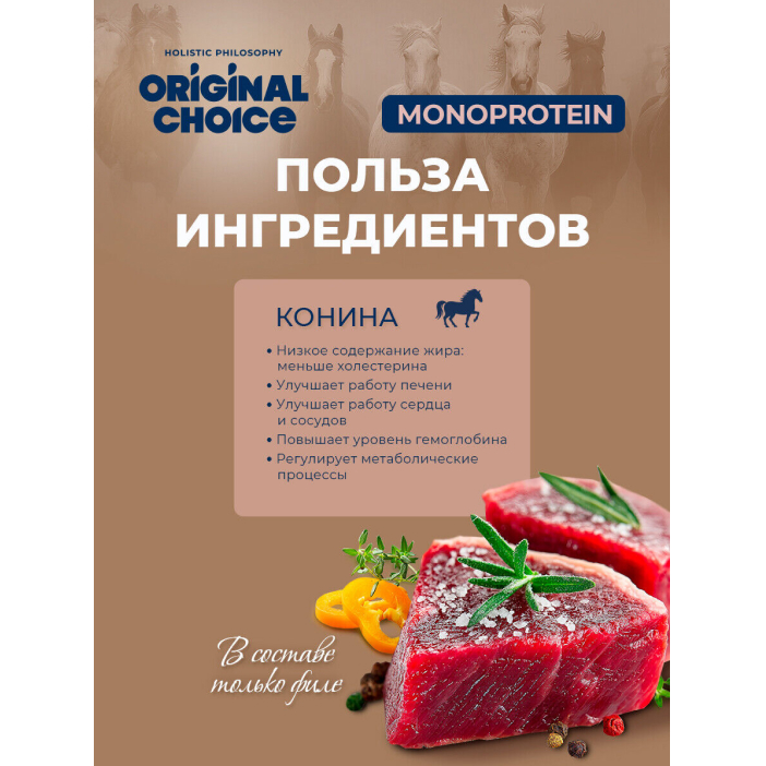 Забота о деталях – наш главный приоритет! ORIGINAL CHOICE MONOPROTEIN ADULT MINI разработан с учетом особенностей метаболизма маленьких пород, чтобы ваш питомец оставался энергичным и здоровым долгие годы. Подарите своему маленькому другу королевское питание! ORIGINAL CHOICE – это выбор тех, кто понимает, что размер питомца не определяет его потребности в качественном питании.