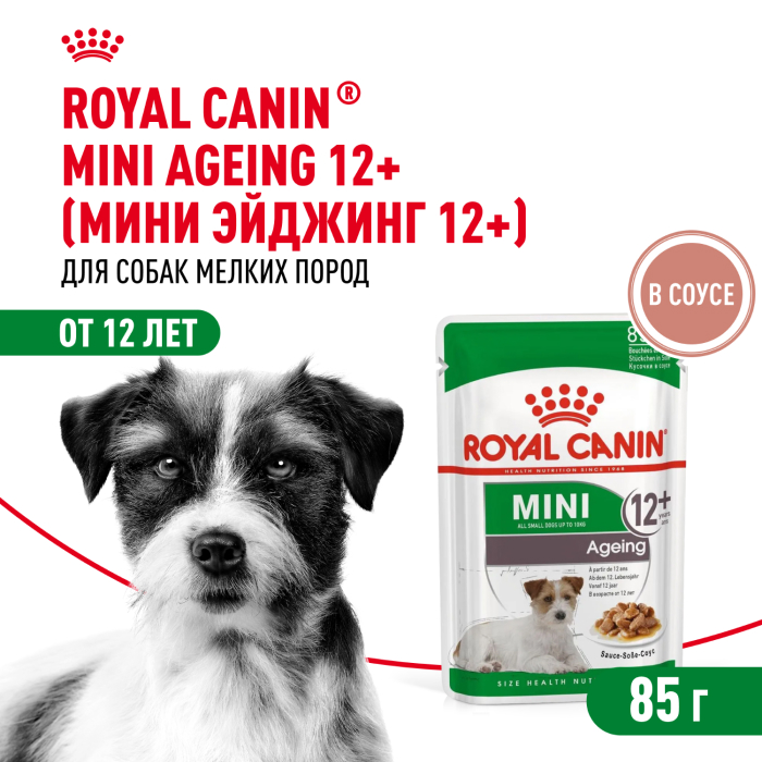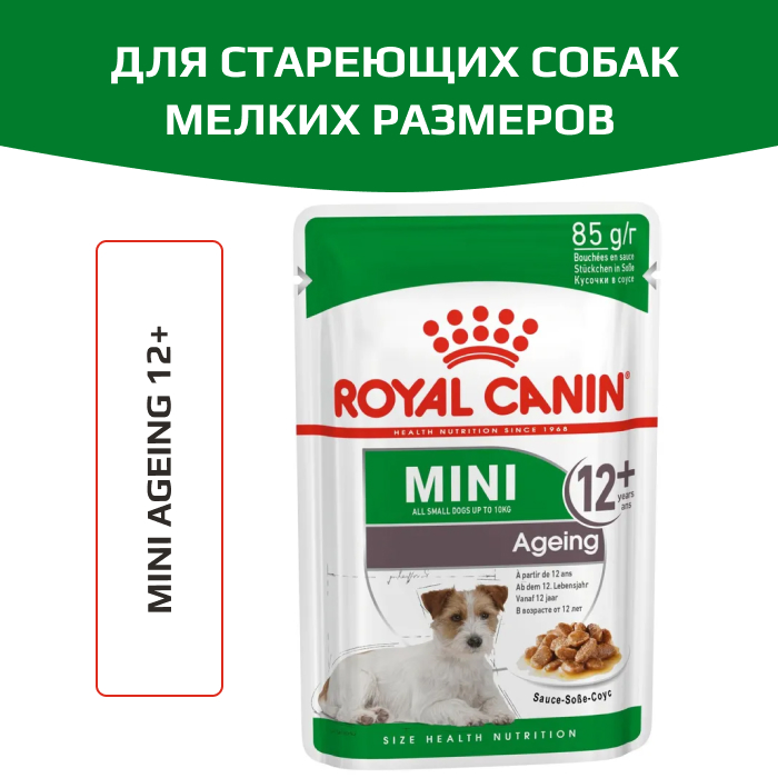 Корм консервированный полнорационный для стареющих собак мелких размеров (весом от 1 до 10 кг) в возрасте старше 12 лет MINI AGEING 12+ (МИНИ ЭЙДЖИНГ 12+) ROYAL CANIN, кусочки в соусе, подходящий для собак мелких пород в возрасте старше 12 лет, специально разработан с учетом потребностей вашей собаки в питательных веществах.