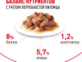 мясо и мясные субпродукты, мука из зерновых культур, подсолнечное масло, загустители, продукты растительного происхождения (в том числе растительная клетчатка), изолят растительных белков*, рыбий жир, витамины и минеральные вещества (в том числе витамин Е и витамин С), аминокислоты (в том числе таурин, L-карнитин), продукты животного происхождения, томатный порошок (источник ликопина), маннанолигосахариды, краситель, сахара, экстракт бархатцев прямостоячих (источник лютеина).