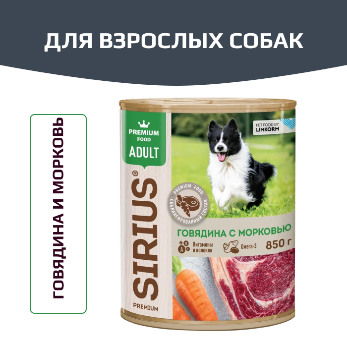 SIRIUS корм влажный полнорационный для взрослых собак, говядина и морковь.