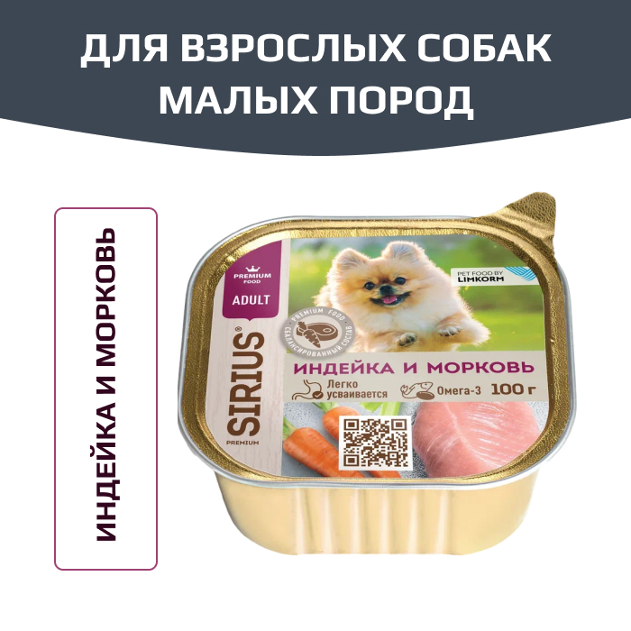 SIRIUS корм влажный полнорационный для взрослых собак малых пород, индейка и морковь.