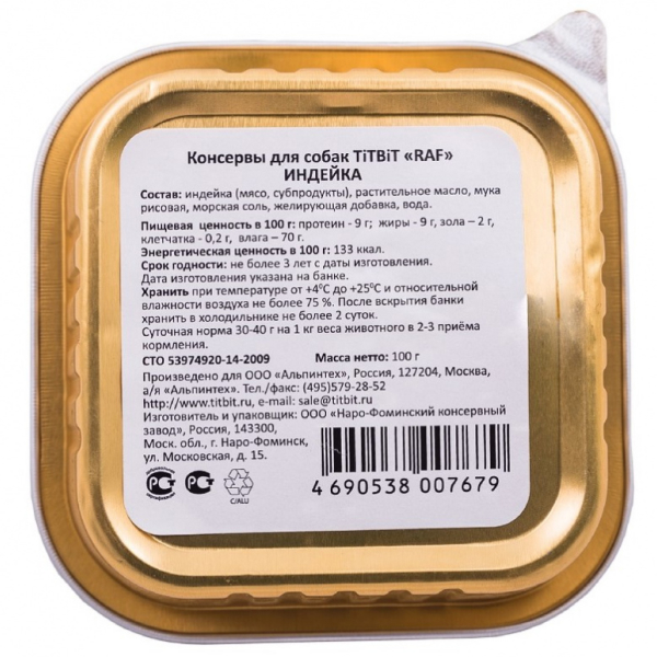 TiTBiT RAF корм консервированный для собак, индейка, паштет.