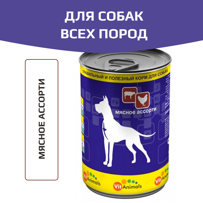Полноценный влажный корм для взрослых собак всех пород VitAnimals мясное ассорти изготовлен из натурального российского сырья. Не содержит сои, ароматизаторов, искусственных красителей, ГМО.