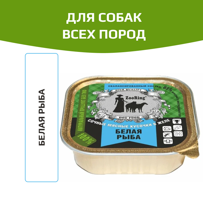 ZooRing корм консервированный для собак кусочки в желе белая рыба.
