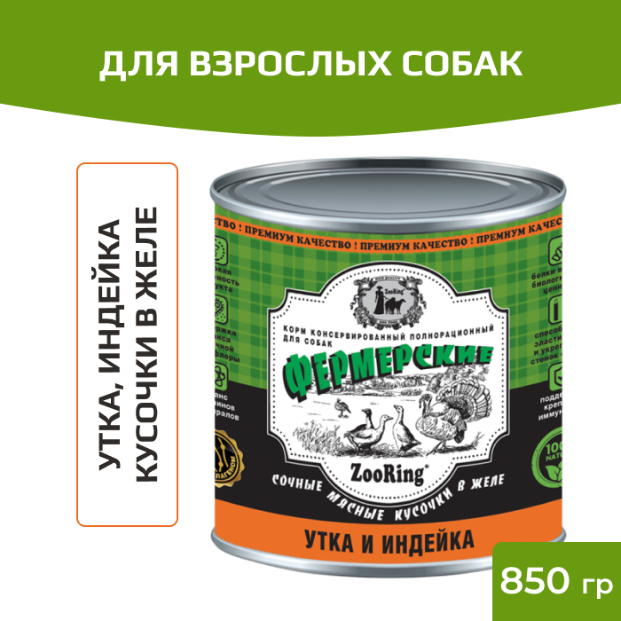 ZooRing Фермерские корм консервированный для собак сочные кусочки мяса в желе утка и индейка.