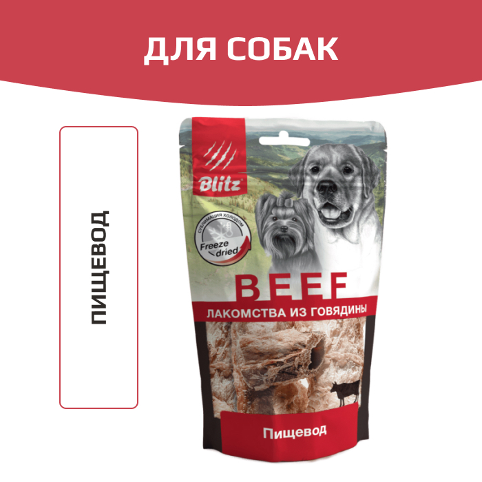 Для приготовления сублимированного лакомства Blitz для собак используется говяжий пищевод, или, как ещё называют этот субпродукт — пикальное мясо, представляющее собой пластинки мышечной ткани, внутри которых находится аппетитная мягкая жилка. Для вашей собаки — это настоящий изысканный деликатес, который не только доставит ей огромное удовольствие, но и принесёт большую пользу. В пищеводе нет жира, зато много белка с полноценным аминокислотным составом, витаминов и микроэлементов.
