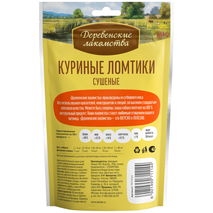 Деревенские лакомства - это серия уникальных лакомств для собак и кошек. В составе продукта 100% мясо, специально нарезанное и запеченое в печи. В каждой пачке содержатся все необходимые питомцу витамины, минералы и микроэлементы.