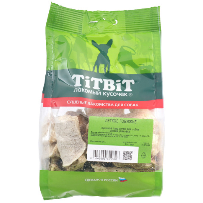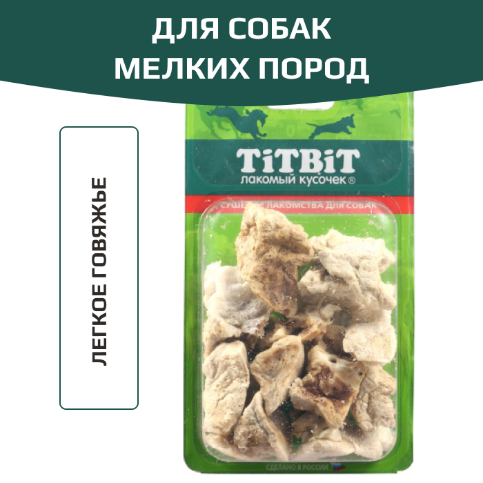 Кусочки высушенного говяжьего легкого. Высокое содержание микроэлементов и соединительной ткани дополняет удовольствие собаки от нежного лакомства. Легкие очень вкусны, малокалорийны и замечательно усваиваются организмом. Легкие содержат практически такой же набор витаминов, как и мясо, но зато гораздо менее жирные. Оказывают положительное воздействие на состояние кожи, шерсти и общий обмен веществ. Кусочки очень удобно использовать в качестве поощрения при дрессуре, и просто на прогулках. Для собак всех пород и возрастов. Особенно рекомендуется для собак с неполной зубной формулой и возрастными изменениями зубочелюстного аппарата. Благодаря вкусовым качествам и воздушной структуре является одним из самых любимых лакомств для наших четвероногих друзей.