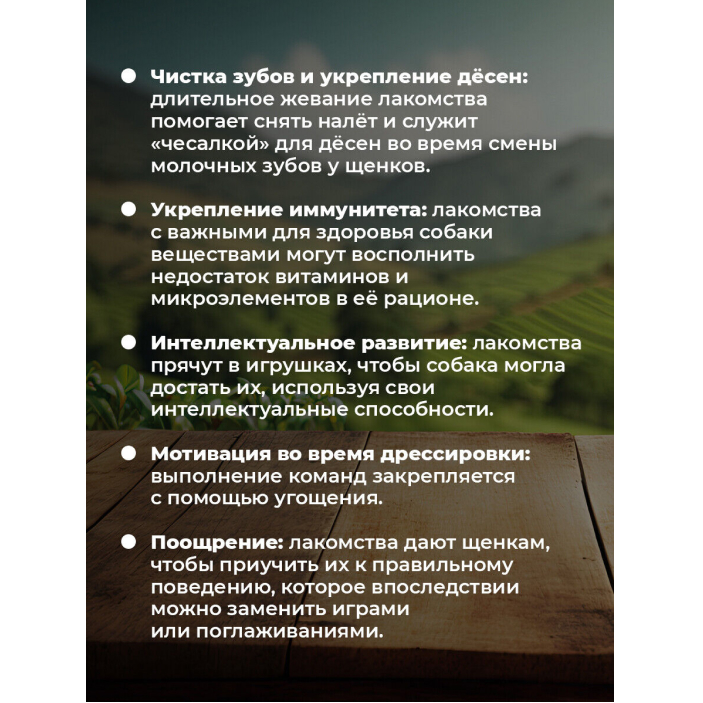 При изготовлении наших лакомств используется особый процесс изготовления - сублимация, при котором сохраняются все полезные витамины, минералы и микроэлементы, улучшающие работу желудочно-кишечного тракта, а также помогают при профилактике кариеса и зубного камня.