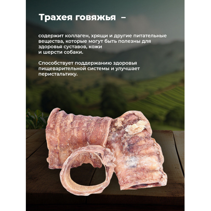 Полезные вещества: Трахея содержит коллаген, хрящи и другие питательные вещества, которые могут быть полезны для здоровья суставов, кожи и шерсти собаки.