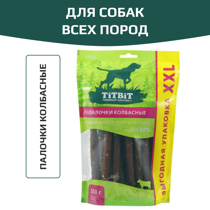Лакомство для собак всех пород титбит Палочки колбасные XXL 550 г. Палочки колбасные - это аппетитное угощение для собак всех пород. Благодаря содержанию мяса и бережной технологии приготовления, имеет привлекательный внешний вид и вкус. Мясо и мясные субпродукты, входящие в основу колбасных палочек, являются превосходным источником высококачественного животного белка, витаминов и минералов. Выгодная XXL упаковка с удобным замком zip-lock сохранит лакомство и продлит удовольствие Вашего любимца.