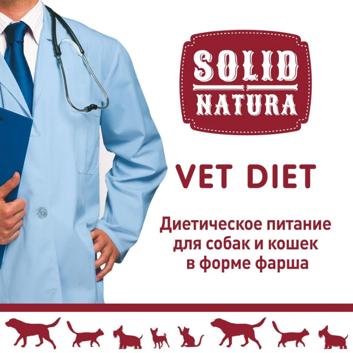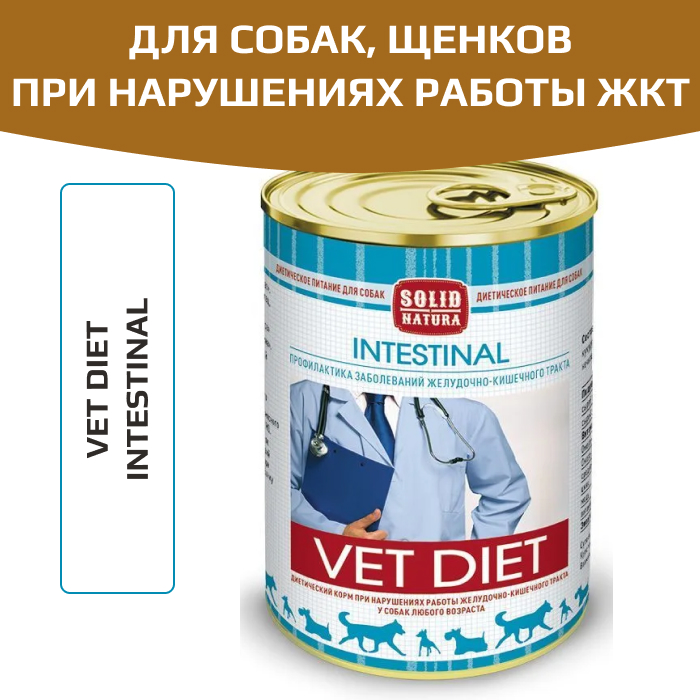 Влажный корм VET Intestinal (здоровье жкт) диета для собак, всех возрастов и всех пород. Корм Solid Natura Vet Diet Intestinal (консерв.) для собак, профилактика заболеваний ЖКТ Диетический корм при нарушениях работы желудочно-кишечного тракта у собак любого возраста. Особенности линейки Vet Diet: Диеты изготовлены на основе свежего мяса, что повышает вкусовую привлекательность и снижает процент отказа питомцев от корма. Сбалансированные диеты предназначены для кормления на период рецидива заболевания, выздоровления и на постоянной основе в случае необходимости. Отсутствие искусственных добавок, усилителей вкуса, гормонов, антибиотиков и ГМО значительно уменьшает риск осложнений и способствует скорейшему выздоровлению. Поставляются в комплекте с крышками, что позволяет хранить открытые банки