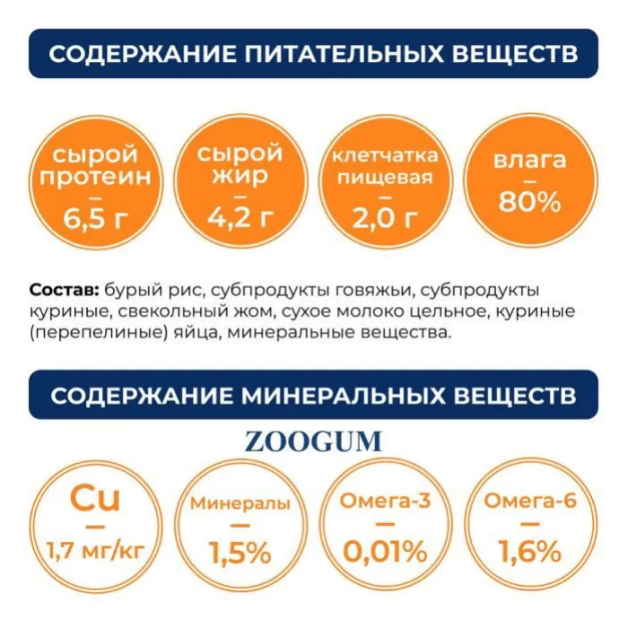 бурый рис, субпродукты говяжьи, субпродукты куриные, свекольный жом, сухое молоко цельное, куриные (перепелиные) яйца, минеральные вещества.