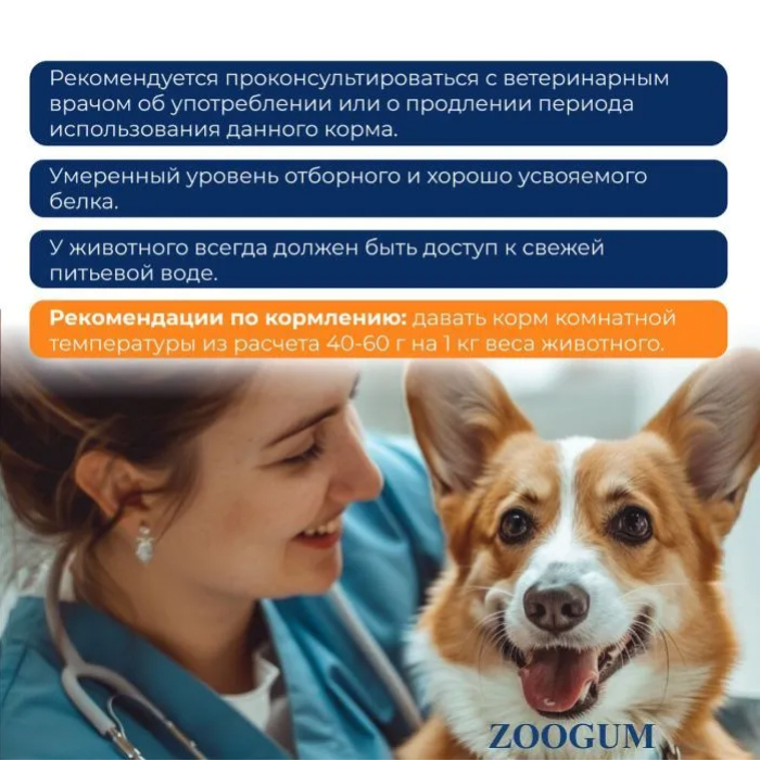 РЕКОМЕНДУЕТСЯ ПРОКОНСУЛЬТИРОВАТЬСЯ С ВЕТЕРИНАРНЫМ ВРАЧОМ ОБ УПОТРЕБЛЕНИИ ИЛИ О ПРОДЛЕНИИ ПЕРИОДА ИСПОЛЬЗОВАНИЯ ДАННОГО КОРМА. У ЖИВОТНОГО ВСЕГДА ДОЛЖЕН БЫТЬ ДОСТУП К СВЕЖЕЙ ПИТЬЕВОЙ ВОДЕ.