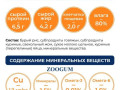 сырой протеин - 6,5 г, сырой жир - 4,2 г; клетчатка пищевая -2,0 г, влага - 80%. Энергетическая ценность 100 г продукта – 100 ккал. Витамины и минеральные вещества в 100 г продукта: минеральные вещества – 1,5%; Омега-3 жирные кислоты – 0,01%; Омега-6 жирные кислоты – 1,6%; медь – 1,7 мг/кг.