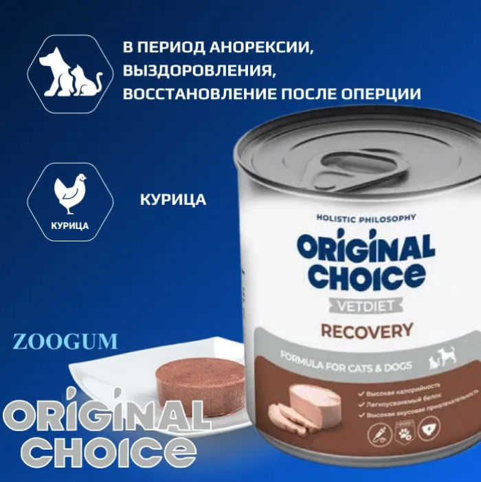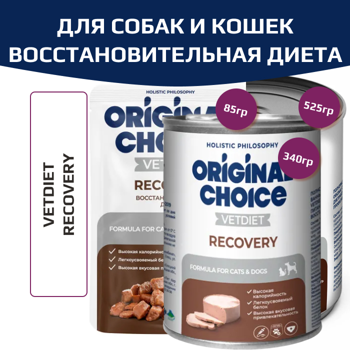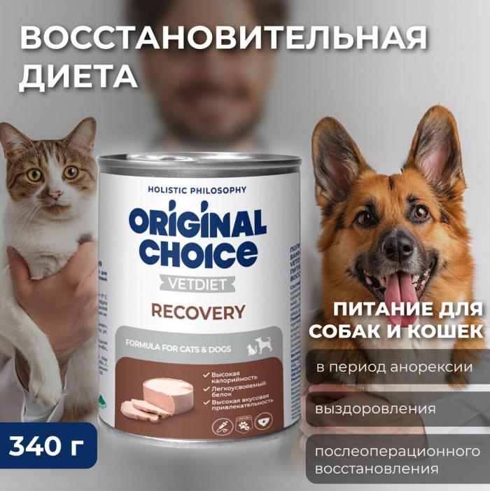 Полнорационный консервированный легкоусвояемый корм Original Choice Vetdiet Recovery предназначен в качестве диетического питания для собак и кошек в период анорексии, выздоровления, послеоперационного восстановления.