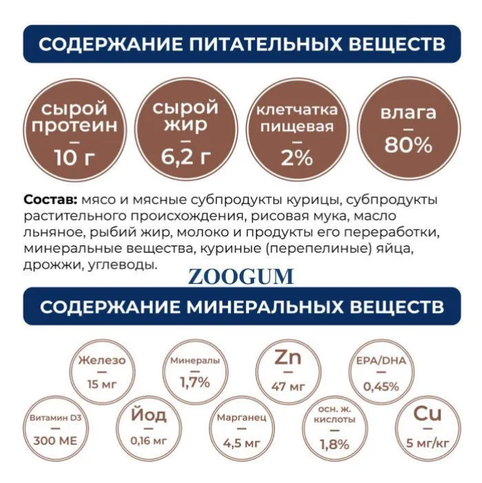 сырой протеин -14,0 г, сырой жир - 6,2 г, минеральные вещества – 1,7%, клетчатка пищевая - 2%, влага - 72,5%, усвояемая энергия (собака) - 1160 ккал/кг, усвояемая энергия (кошка) – 1200 ккал/кг, основные жирные кислоты – 1,8%, EPA/DHA – 0,45%, медь – 5 мг/кг. Энергетическая ценность 100 г продукта – 108 ккал. Витамины и минеральные вещества в 100 г продукта: витамин D3 – 300 МЕ, железо – 15мг, йод – 0,16 мг, марганец – 4,5 мг, цинк – 47 мг.
