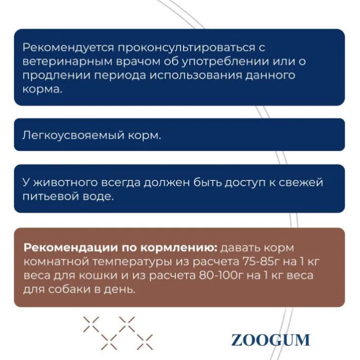 РЕКОМЕНДУЕТСЯ ПРОКОНСУЛЬТИРОВАТЬСЯ С ВЕТЕРИНАРНЫМ ВРАЧОМ ОБ УПОТРЕБЛЕНИИ ИЛИ О ПРОДЛЕНИИ ПЕРИОДА ИСПОЛЬЗОВАНИЯ ДАННОГО КОРМА. У ЖИВОТНОГО ВСЕГДА ДОЛЖЕН БЫТЬ ДОСТУП К СВЕЖЕЙ ПИТЬЕВОЙ ВОДЕ.