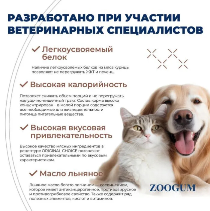 Высокое качество мясных ингредиентов в рецептуре ORIGINAL CHOICE позволяют оставаться привлекательными по вкусовым характеристикам.