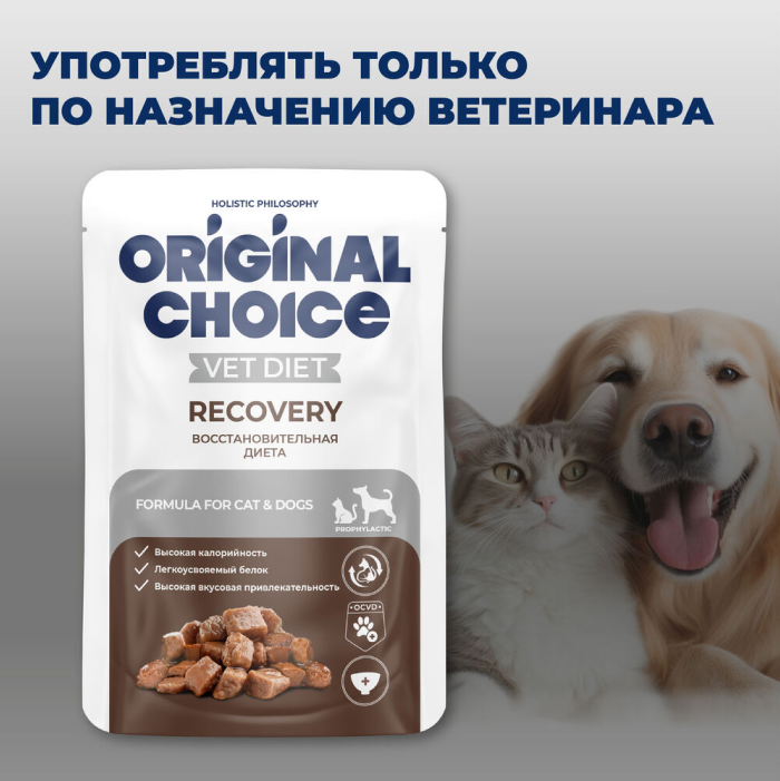Original Choice Vetdiet Recovery - это высокая калорийность: позволяет снижать объем порций и не перегружать желудочно-кишечный тракт.