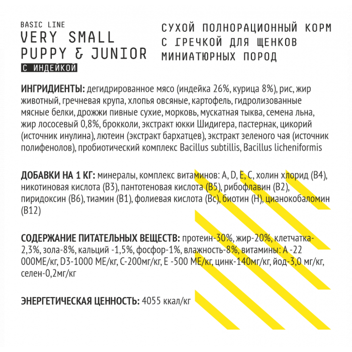 дегидрированное мясо (индейка 26%, курица 8%), рис, жир животный, гречневая крупа, хлопья овсяные, картофель, гидролизованные мясные белки (вкусоароматическая добавка),дрожжи пивные сухие,морковь,мускатная тыква,семена льна, жир лососевый 0,8%, брокколи, экстракт юкки Шидигера, пастернак, цикорий (источник инулина), лютеин (экстракт бархатцев), экстракт зеленого чая (источник полифенолов), пробиотический комплекс Bacillus subtillis, Bacillus licheniformis, минералы, комплекс витаминов: А, D, Е, С, холин хлорид (В4), никотиновая кислота (В3), пантотеновая кислота (В5), рибофлавин (В2), пиридоксин (В6), тиамин (В1), фолиевая кислота (Вс), биотин (Н), цианокобаломин (В12).