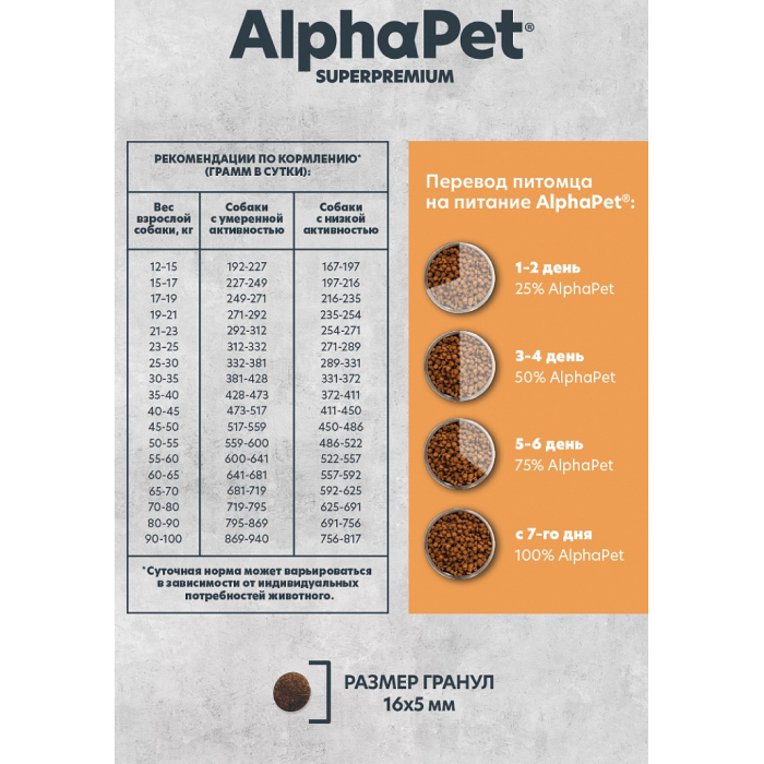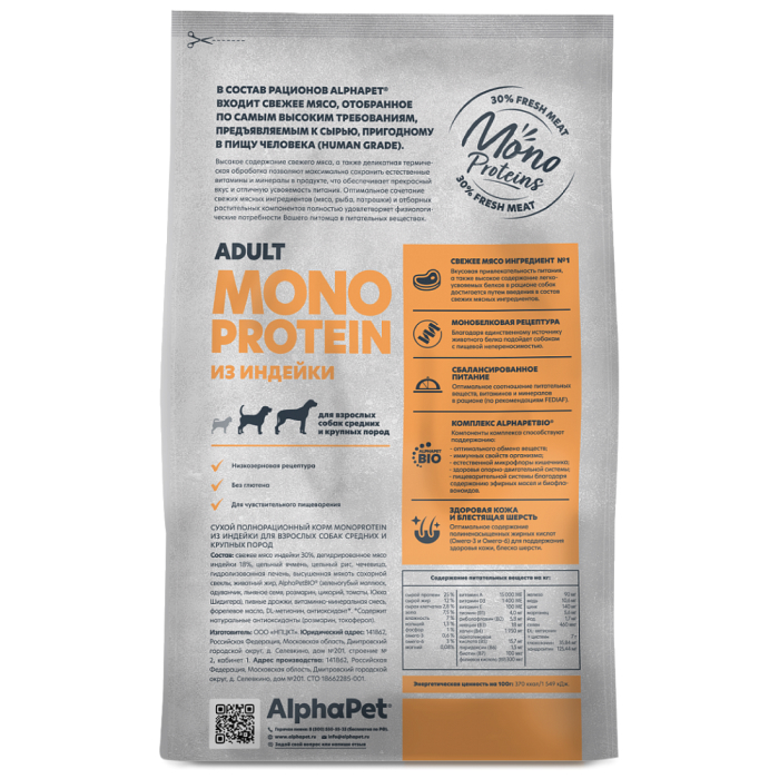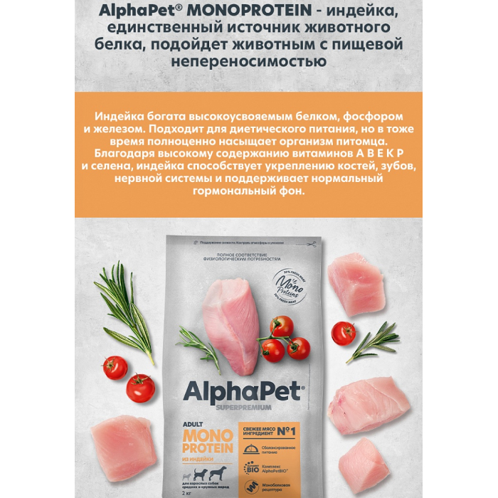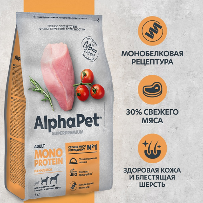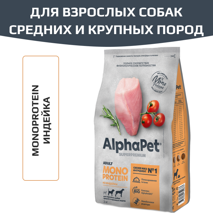 AlphaPet Superpremium MONOPROTEIN / Сухой полнорационный корм из индейки для взрослых собак средних и крупных пород