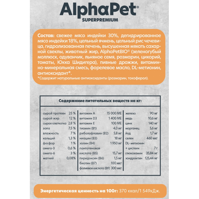 Свежее мясо индейки 30% Дегидрированное мясо индейки 18% Цельный рис Цельный ячмень Чечевица Гидролизованная печень Животный жир Пивные дрожжи Высушенная мякоть сахарной свеклы AlphaPetBIO® (зеленогубый моллюск, одуванчик, льняное семя, розмарин, цикорий, томаты, Юкка Шидигера) Витаминно-минеральная смесь Форелевое масло DL-метионин Антиоксидант (Содержит натуральные антиоксиданты (розмарин, токоферол))