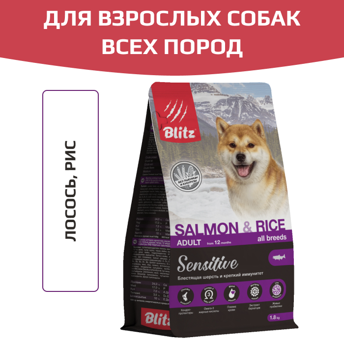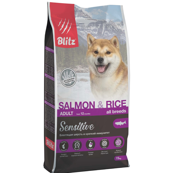 Сухой корм Blitz Salmon & Rice создан для взрослых собак всех пород — он подойдёт и лабрадорам, и шпицам, и корги, и суровым защитникам, и весёлым компаньонам. Формула разработана для животных с чувствительным пищеварением и объединяет сразу несколько преимуществ: потрясающий вкус, сбалансированный состав, хорошую усвояемость компонентов и бережное воздействие корма на желудочно-кишечную, иммунную и другие системы организма.