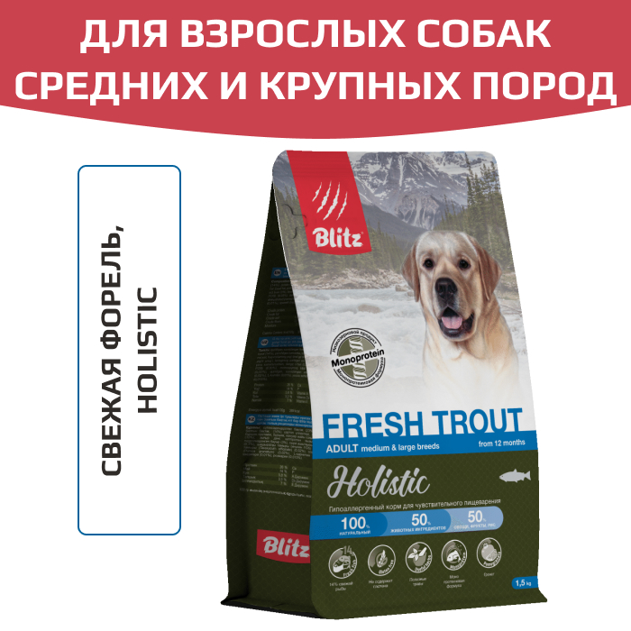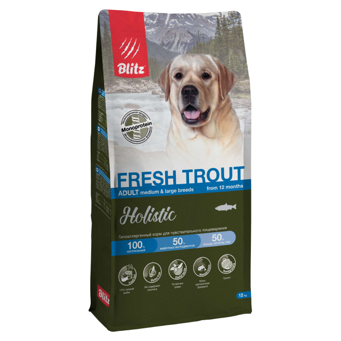 Blitz Holistic Fresh Trout Adult Dog Medium & Large breeds (Monoprotein) монопротеиновый сухой корм для взрослых собак средних и крупных пород, свежая форель.