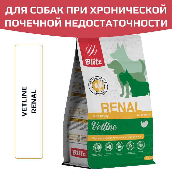 Питание собак при хронической почечной недостаточности прямо влияет на протекание болезни. Сухой корм Blitz Canine Dog ветеринарной линейки Vetline разработан с учётом требований ветеринарных специалистов и диетологов. Он позволяет накормить питомца, не усугубив его состояние, а напротив, добиться замедления поражения почечных нефронов. Рацион может использоваться на разных стадиях заболевания собак в качестве поддержки консервативному лечению. Не рекомендуется совмещать диету Renal с обычным кормом или лакомствами, а также предлагать животному в профилактических целях без назначения врача.