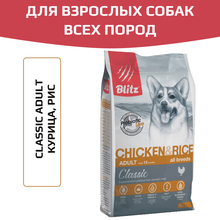 Blitz Classic Chicken & Rice Adult Dog All Breeds корм сухой для собак всех пород с курицей и рисом.