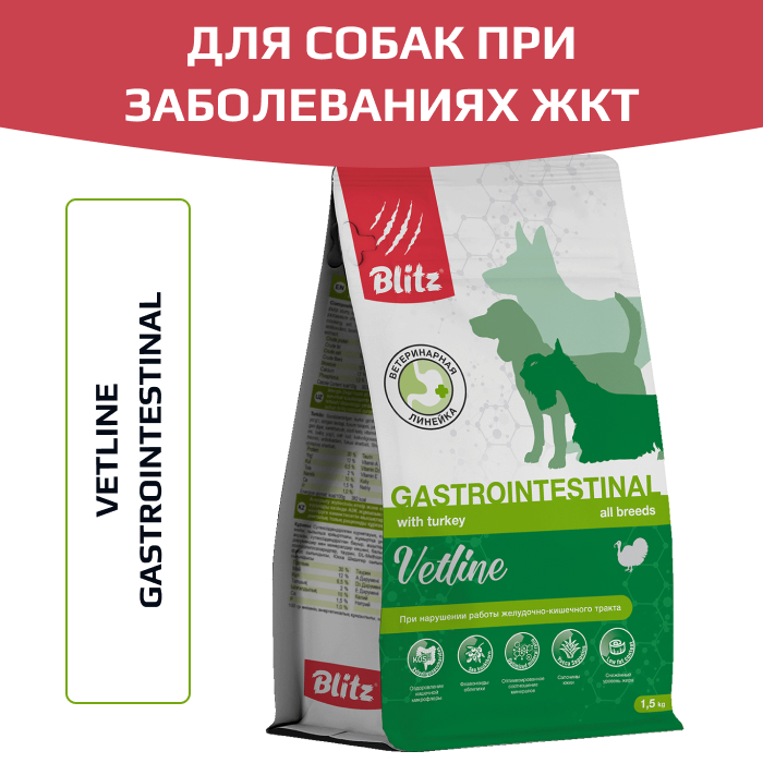 Blitz Vetline Gastrointestinal сухой полнорационный диетический корм для собак при расстройствах пищеварения.
